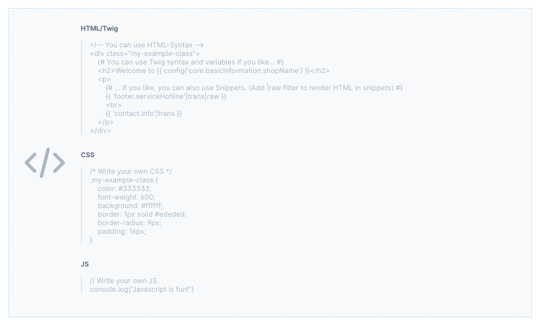 Die Ausgabe des Code Elementes in der Storefront. Wirf einmal einen Blick in die Konsole. Dort wirst Du einen kurzen Javascript Kommentar sehen.
